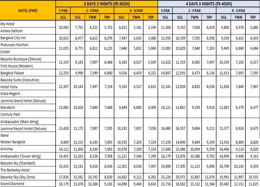 (Airfare is not included & is subject for computation) ITINERARY DAY 1 Arrival in bangkok, Transfer to Hotel DAY 2 Breakfast, Free half day Bangkok City Tour. Visit Golden Buddha Temple, Reclining Buddha Temple, Gem & Thai Souvenir Factory and free lunch. Guest will return to hotel on guest account. DAY 3 Breakfast ,free day or free until transfer to the airport for 3days 2 nights. Day 4 Breakfast, free until transfer to the airport for 4days 3 nights. We also customize tour packages according to the client's preferences. Remarks: * Child No Bed = Php 3,675/child (from 2-10 years) * Infant = Free of charge (below 2 years) * rate as above is based on per person * Supplement Charge for out of service time from 10:30 pm - 06:30 am at Php500/person per way |